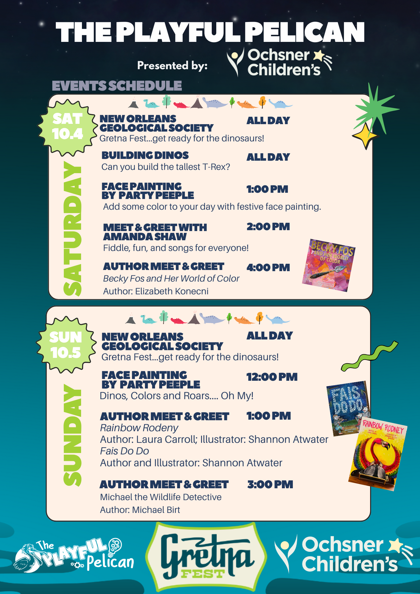 Our new Kids Activity Center by Playful Pelican, presented by Ochsner Children’s, will be located at the Ferry House on Saturday and Sunday with fun for all ages!
